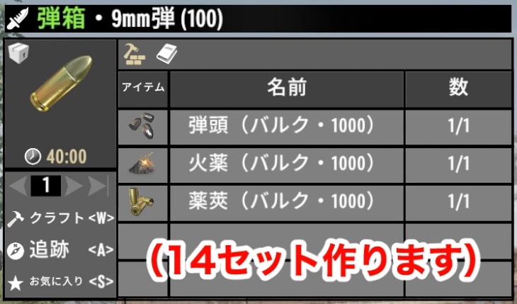 弾頭、火薬、薬莢をそれぞれ「バルク・1000」にできます。スタック数は10です。