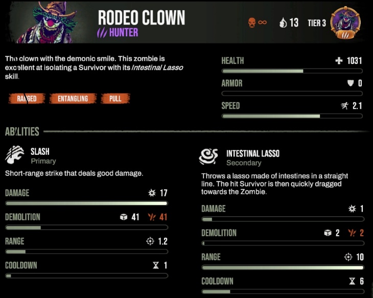 The Rodeo Clown is a brand new Tier 3 Hunter zombie with a new pull mechanic to snatch survivors out of the safety of their trap-laden hidey holes.