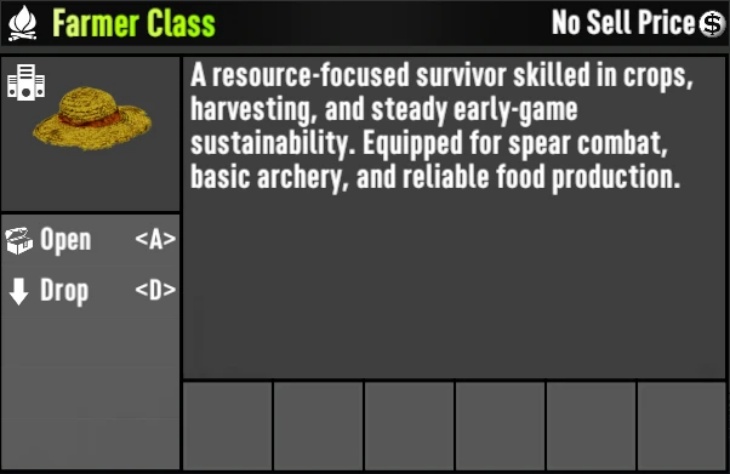 A self-sufficient survivor focused on agriculture, food stability, and long-term growth. The Farmer begins with early crops, farm plots, and basic archery tools to secure steady resources for themselves — or the whole server.