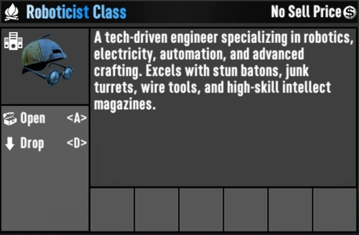 A tech-driven engineer specializing in electricity, robotics, and automated defenses. The Roboticist excels at crafting, wiring, and deploying junk-based weaponry, beginning with tools and materials that support early technical builds.