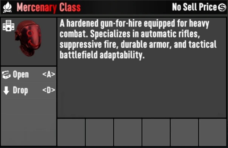 A seasoned combat veteran equipped to handle direct firefights and heavier engagements. With automatic rifles, tactical armor, and solid backup tools, the Mercenary is built for dependable strength in open combat.